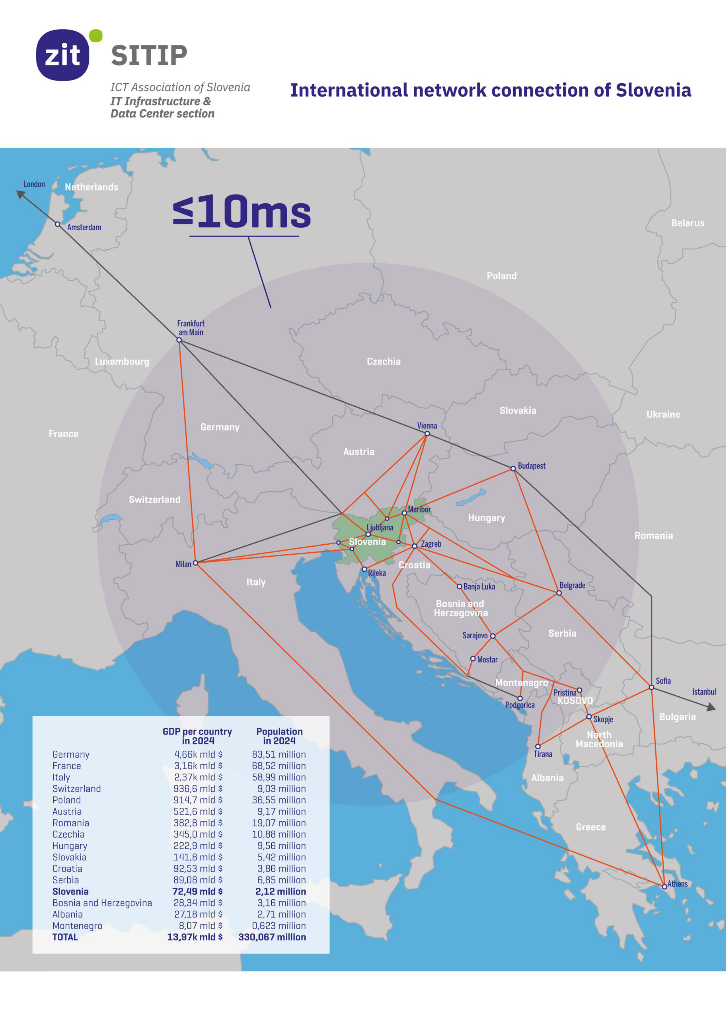 Slovenia’s location at the crossroads of Central Europe, the Balkans, and the Mediterranean makes it an excellent digital and network hub. This geographic position allows Slovenia to serve multiple markets including Austria, Northern Italy, Croatia, Serbia and other Western Balkan countries. With 10 ms latency Slovenia's netwrok connection provides access possibilities to other key business regions in Europe – as represented by the below map.